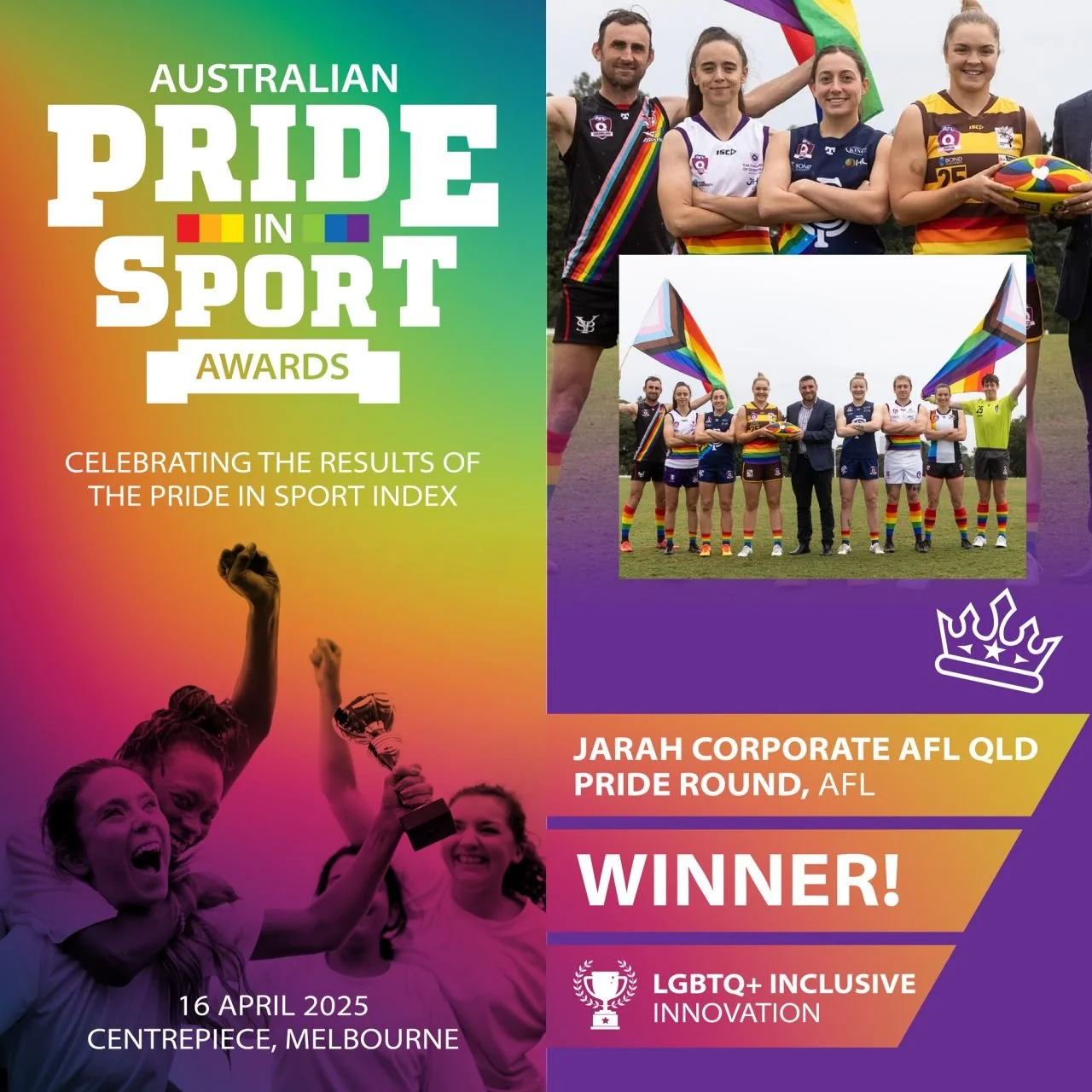 Huge congratulations to AFL Queensland for taking home the LGBTQ+ Inclusive Innovation Award for the ground breaking 2024 Jarah Corporate AFLQ Pride Round initiative!